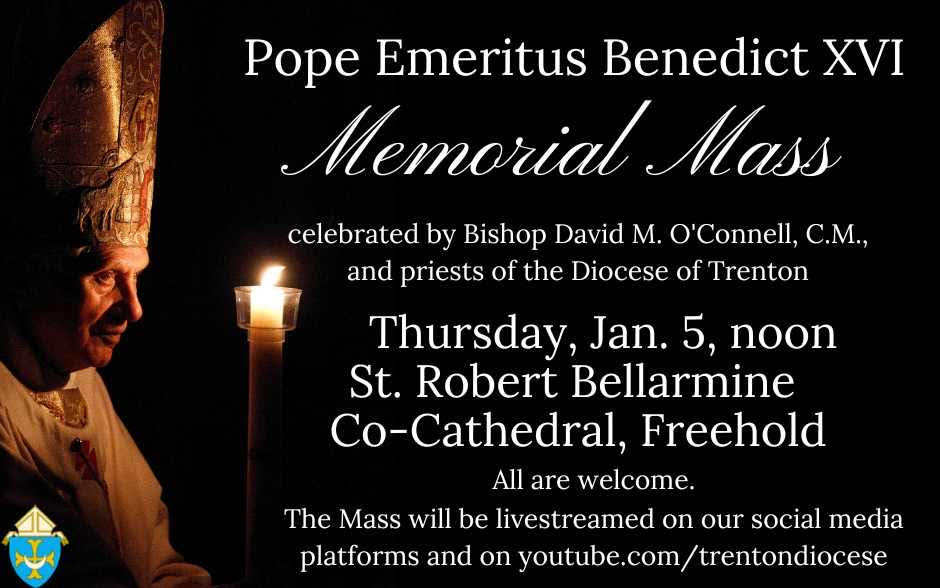 Bishop David M. O'Connell, C.M., will celebrate a memorial Mass for Pope Emeritus Benedict XVI on Thursday, January 5, at noon at St. Robert Bellarmine co-cathedral in Freehold. All are welcome to attend.